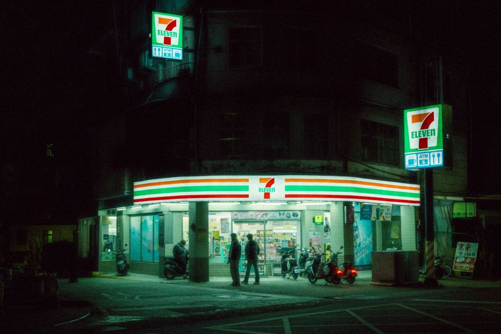 FamilyMart. 7-Eleven. Lawson. Neon signs. Fluorescent lights. Automatic doors.