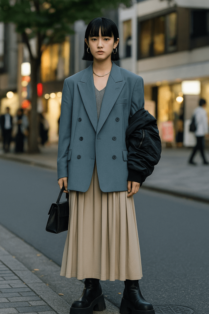 In 2025 Tokyo, style is no longer defined by binary thinking. Long skirts paired with bomber jackets, dainty cardigans layered under tailored menswear, and oversized everything.